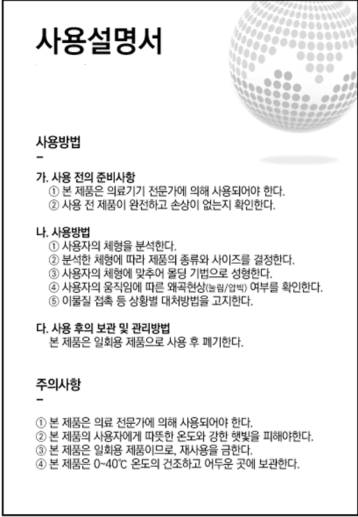사용목적: 신체(허리, 무릎, 목 등)의 일부분을 압박, 고정하는 지지 기능이 있는 기구. 캐스팅 테이프(Casting tape)를 포함하되,